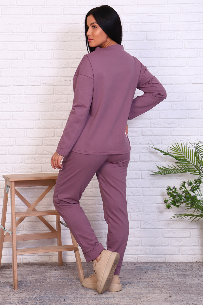 Стильный базовый костюм из хлопкового трикотажа отличного качества. Брюки прямого кроя, зауженные к низу, высокая посадка с простроченными стрелками, низ без резинки(не режет ногу), карманы в швах. Трикотажный джемпер длиной до середины бедра. По центру переда декоративный вертикальный защип вытягивает и стройнит. Горловина джемпера с цельнокроеной стойкой, обработана притачной обтачкой. Рукава джемпера длинный двухшовный, рубашечного кроя, линия плеча спущена. Полные размеры