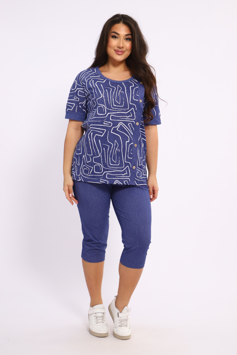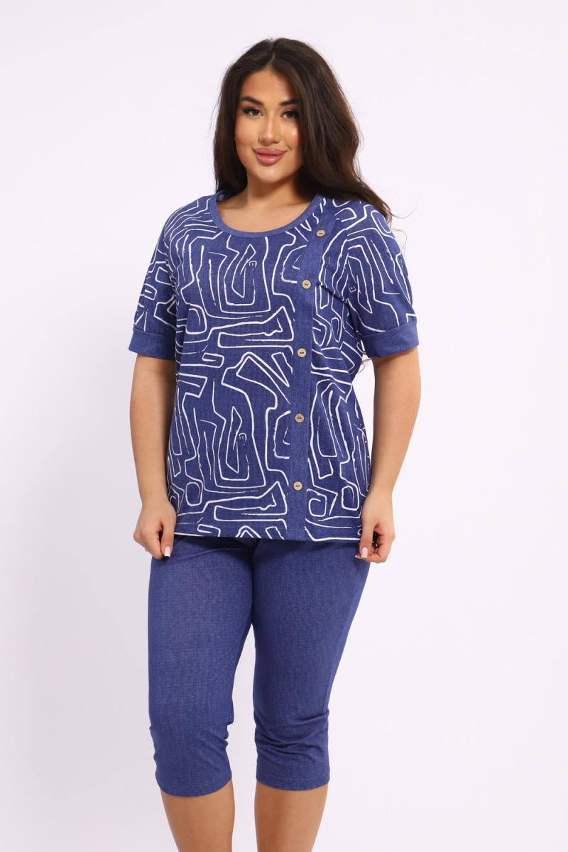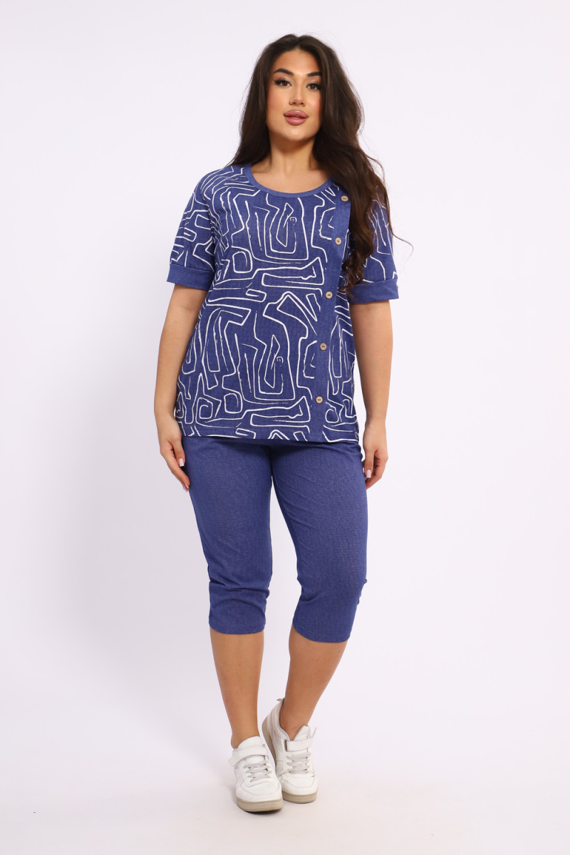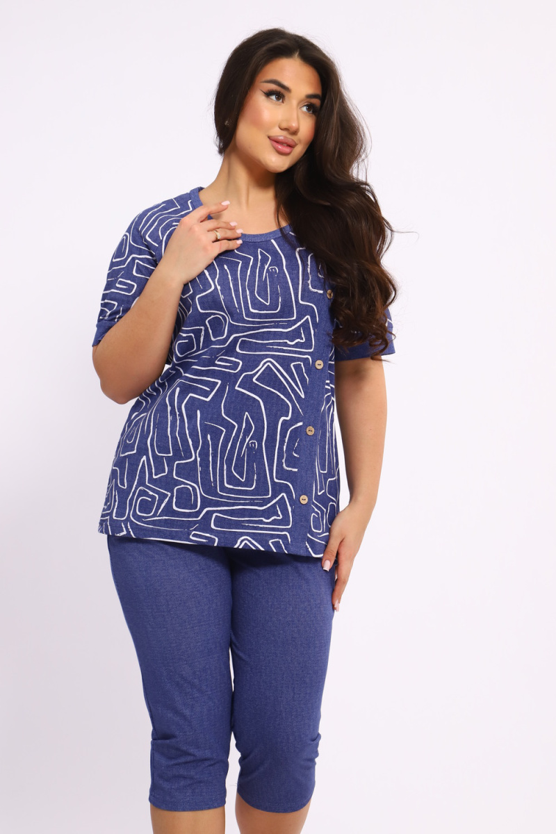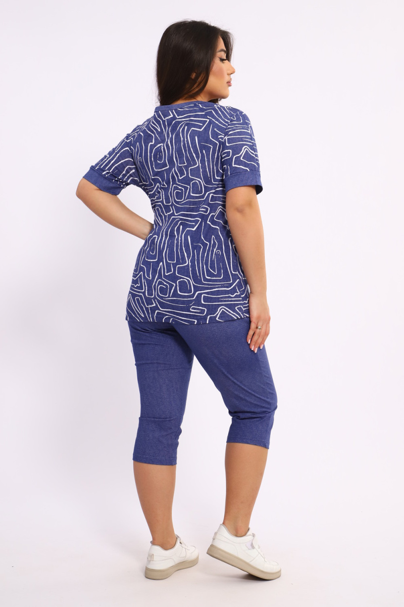 Костюм женский выполнен из трикотажного полотна кулирка. Костюм состоит из футболки и бридж. Футболка свободного силуэта. Бриджи свободного кроя чуть ниже колен.